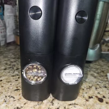 This salt grinder is lovely. Just one press of the button and your meal is seasoned. It even has an adjustment underneath to switch between coarse and fine grain.
